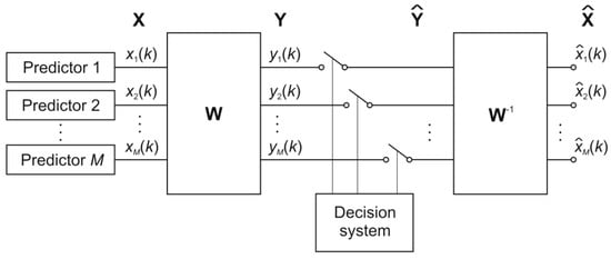 The other approach to fusion is a separation of the time series predicted by different units into the set of independent time series and the elimination of terms corresponding to the identified noise. This can be done by the independent component analysis (ICA) [], delivering the set of independent time series. The process of deflation using only the important components allows for reconstructing the predicted time series deprived of the not important components, treated as the noise [,]. This procedure is illustrated in Figure 5. The set of M predictors generates M time series x(k), which are delivered to the ICA process represented by matrix W. The output signal vector y = [y1(k), y2(k), …, yM(k)]T is the result of linear ICA operation y = Wx and contains the independent signals. The switches in the figure represent the possible elimination of the inappropriate independent components at the reconstruction stage of the data. The inversed matrix W−1 represents the deflation process, i.e., reconstruction of the signals.