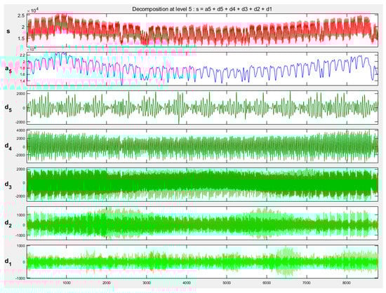 Figure 6 illustrates the result of wavelet decomposition of the time series representing the hourly load of one year. Daubechies wavelet function db4 [,] and five-level decomposition have been applied. The upper curve s represents the original time series, a5 is the coarse approximation of the signal s on the 5th level, and d1–d5 represents the detailed wavelet representations of the original signal on five levels with different resolutions. The time series d1 is of the highest resolution and includes the lowest impact on the approximation of the original time series. In practice, it may be eliminated from the reconstruction.