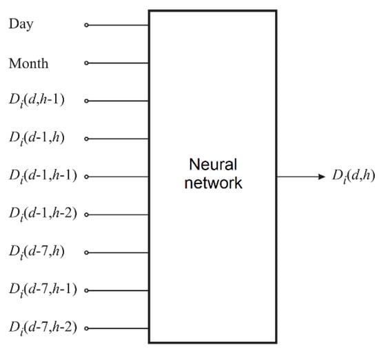 Figure 7 presents the general structure used for the prediction of the wavelet coefficients Di(d,h) for the particular hour h of the day d on the ith level for i = 1, 2, …, N. An identical structure is used for the prediction of the coarse approximation signal AN(d,h).