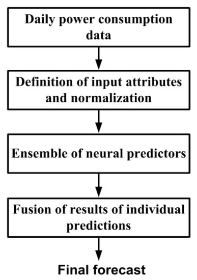 The input data consists of the daily electricity consumption in combination with information about the type of day and season. The next step is the definition of input attributes and their normalization. The attributes can be defined manually using expert knowledge or automatically by applying a deep autoencoder. The attributes after normalization are delivered to the set of neural predictors that form the ensemble. The final step is the fusion of the results generated by each member of the ensemble. This general form of the flowchart allows applying different structures of individual predictors as well as various methods of integrating the results of their prediction.