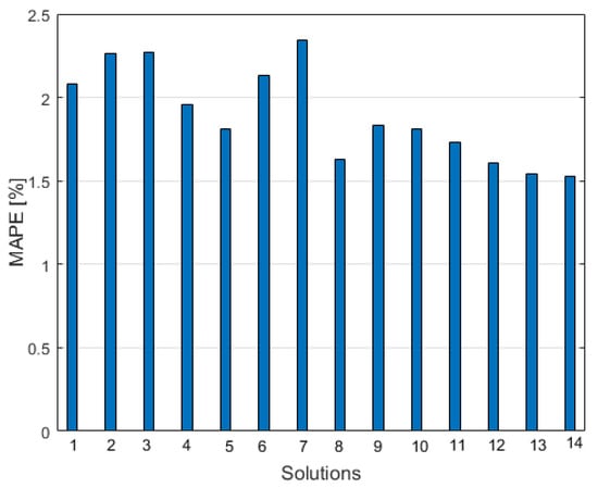 Figure 9 shows the graph of MAPE values corresponding to different approaches to load forecasting. Their positions, denoted by the following numbers, represent: