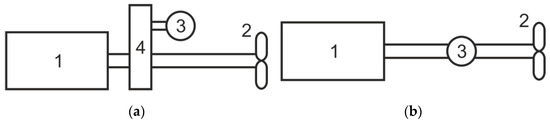 There are many schemes showing the mechanical energy take-up from the propulsion of a sea-going vessel [15,18,23]. In this work, two general types of mechanical energy take-up from the propulsion system of a sea-going vessel have been distinguished. The first one consists of receiving the mechanical energy with the use of special reducers included in the motion transmission system (Figure 1a). The second method of receiving mechanical energy consists of mounting the excitation winding of a synchronous generator directly on a long shaft connecting the drive engine with the ship propeller (Figure 1b).