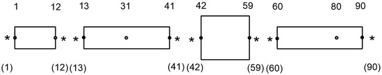 Figure 3 shows n = 90 discretization nodes. Virtual nodes of discretization of spatial derivatives are marked with asterisks [7,23]. The virtual node numbers in the lower part of Figure 3 are shown in parentheses. Some real node numbers are shown at the top of Figure 3 as numbers without parentheses.