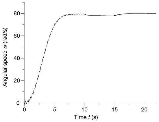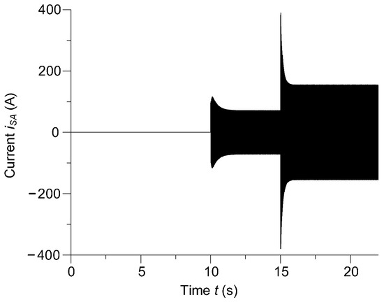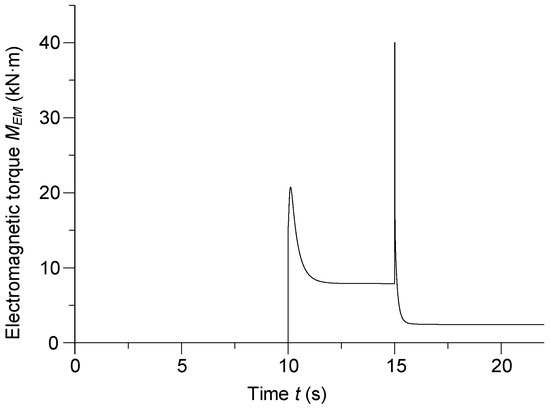 The motion transmission was started by a drive engine (steam or gas turbine, internal combustion engine, etc.) through epicyclic gearing. The experiments were performed as follows. The propulsion was started by applying two moments at the ends of the motion transmission system. The angular speed of the drive engine was approximated by the exponential function of time: ω1 = 316(1 − exp(−0.05t2.3))/p0, where p0 is number of pole pairs of the shaft generator. At the same time, the shaft generator was disconnected from the ship’s network. During the start, the voltage of the excitation winding was reduced to 70% of the rated voltage. The generator was started from idle. Once the rotor neared the synchronous speed, the generator was connected to the ship’s power grid. The resistive-inductive load as well as the excitation voltage were increased to the rated values. Then, the symmetrical three-phase short-circuit condition of the machine armature windings was analyzed. In a real system, the power-system automation would disconnect the generator from the grid and from the excitation voltage source. During modeling, the short circuit was deliberately extended to 7 s.