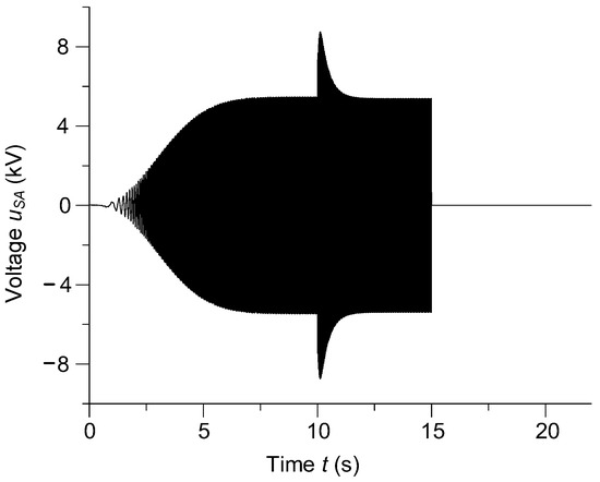During the start-up of the ship’s propulsion, the generator armature winding was opened. The shaft generator was accelerating when idle. After reaching the rated voltage, the generator was loaded. In order to maintain the rated value of the armature voltage when the electrical load is applied, the excitation voltage of the generator is increased. At the time t = 10 s, the voltage value at the shaft generator terminals increased by 50%. This voltage step is associated with an increase in the electromotive force (EMF). Consequently, this causes an increase in the generator’s currents and electromagnetic torque. When the generator goes into a short-circuit condition, the voltage at the armature terminals drops to zero.