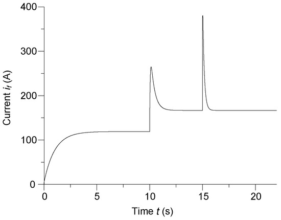 A completely different situation occurs in the case of a synchronous generator short-circuit condition in the time t ≥ 15 s. Then, a surge short-circuit current begins to flow in the generator windings, which is very dangerous for the generator. In addition to thermal damage to the insulation of the stator and rotor wires, the surge current also causes mechanical stresses in the generator, which can damage the generator. In such cases, the power-system automation should disconnect the generator from the ship’s electricity network. DC voltage supplying the excitation winding of the generator should also be turned off. After 2.5 s from the generator’s short-circuit beginning, steady short-circuit currents flow in its stator (armature) windings, the value of which is usually about 2–3 times higher than the rated one.