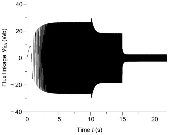 From a scientific point of view, based on the interpretation of the time courses presented in Figure 8 and Figure 9, it is possible to determine the nature and time courses of the electromotive forces induced in the armature and rotor windings, because the time derivatives of the analyzed flux linkages according to Faraday’s law represents the induced electromotive forces, i.e., the main energy sources of the shaft generator.