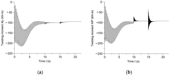 The instantaneous moment of torsion of the (a) second shaft and (b) fourth shaft of the ship’s motion transmission.