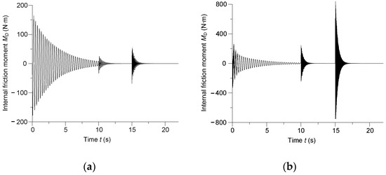 Instantaneous internal friction moment in the: (a) second shaft and (b) fourth shaft of the ship’s motion transmission.