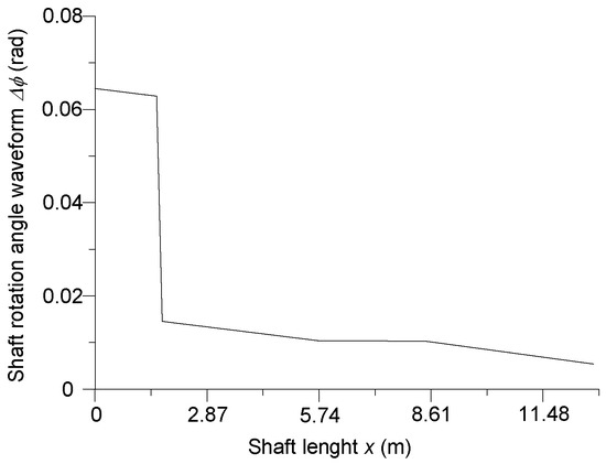 The angle of rotation shown in Figure 13 provides information on the torsional moments in individual parts of the long propeller shaft, which, from the point of view of shaft strength, is an important element for the entire motion transmission. When analyzing Figure 13, it can be seen that the flexible coupling is the most loaded (x = 1.66 m). The fourth part of the long propeller shaft is also heavily loaded (see Figure 10b and Figure 11b). The third part of the long propeller shaft (generator rotor) is characterized by a low twisting load.