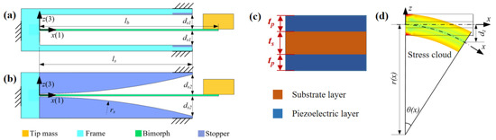 Schematic of PVEH (a) PVEH-1: cantilever configuration with point stopper. (b) PVEH-2: cantilever configuration with arc stopper. (c) Schematic of bimorph thickness. (d) Schematic of bimorph bending cross-section.