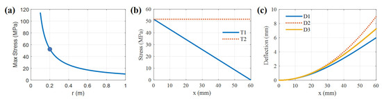 (a) Simulation curve of PZT maximum stress with curvature radius r. (b) Simulation surface stress curves of transverse force cantilever model T1 and equal curvature beam model T2 along the x axis. (c) Simulation deflection curves of transverse force cantilever model D1 and equal curvature beam model D2 along the x axis.