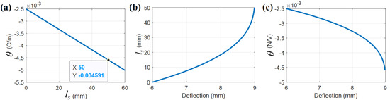 Tip deflection is the independent variable for the vibration system. The simulation curve of the relationship between tip deflection and contact length is shown in Figure 3b. The relationship between tip deflection and electromechanical coupling coefficient is shown in Figure 3c.
