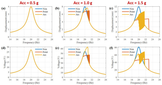 Simulation frequency response curves of PVEHs with non-stopper, point stopper, and arc stopper, respectively, at different acceleration levels. Displacement response curves at acceleration of (a) 0.5 g, (b) 1.0 g, (c) 1.5 g. Voltage response curves at acceleration of (d) 0.5 g, (e) 1.0 g, (f) 1.5 g.