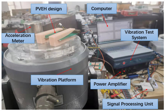 As shown in Figure 5, the main equipment for vibration excitation consists of a PC, a vibration test system that generates excitation signals, a power amplifier that enhances the excitation signals, a signal processing unit (NI USB-6009) that collects the output voltage data, a vibration platform (Econ VT9002) that provides excitation and acceleration, and a meter (Econ EV4200) that collect the status of the platform and can be part of the close-loop control, which helps the system generate the stable output signals. The vibration signals generated from the test system could be enhanced by the power amplifier to drive the platform to move frequently. With the excitation applied at the end of the PVEH design, the signal-processing unit could collect the output voltage from the piezoelectric cantilever beam and display it via the PC.