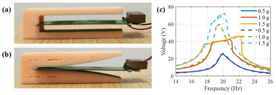Prototypes of the PVEHs are shown in Figure 6a,b; PVEH geometric design parameters are shown in Table 1. The polylactic acid (PLA) for the connector and stopper were fabricated by 3D printing. The end of the cantilever beam is fixed by ergo 5800 glue. The material of the PZT-5H piezoelectric bimorph is the same as ref. [20]. Two piezoelectric layers of bimorph are connected in parallel, with the same direction of polarization. Meanwhile, the metal layer in the middle shares the electrode.
