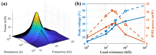 The power performance of PVEHs in 1 g acceleration is shown in Figure 7. Theoretical simulation of the curved surface of the RMS power with load resistance and frequency is plotted in MATLAB according to Equation (10) without the . The ideal output power is 27.5 mW at 30 kΩ in 19.5 Hz without the stopper; however, stoppers will limit the actual power output. Experimental curves of peak voltage and RMS power with load resistance in the resonate state indicate PVEH-1 only has a maximum RMS power of 12.9 mW at 30 kΩ, while PVEH-2 has the maximum RMS power of 20.7 mW at 20 kΩ. That means PVEH-2 with an arc stopper wastes less power than PVEH-1 with a point stopper.