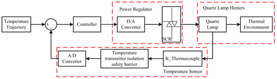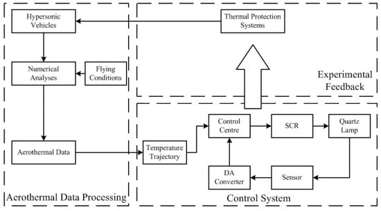We established a thermal-structural test with quartz lamp heaters (TSTQLH), including aerothermal data processing, a thermal-structural control system, and experimental feedback. As shown in Figure 1, aerothermal data, called transient aerodynamic heating, is assessed by finite element analyses. There is also a link between aerothermal data and temperature trajectory, the temperature trajectory being a control system tracking target. The TSTQLH control system combined data acquisition with algorithm implementation, and acted on the QLH. Once the TSTQLH control system was obtained with effective dynamic performance when tracking the temperature trajectory, this indicates success in reproducing the real thermal environment for hypersonic vehicles, and the control system can be used to validate the TPS optimization. How to effectively design the control system is essential.