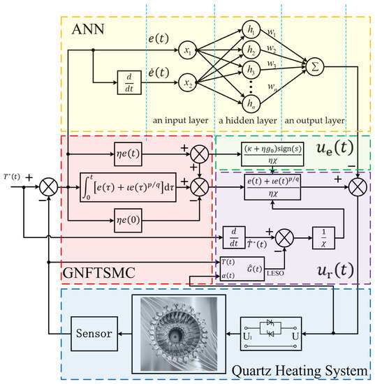 This paper proposes a dynamic model of a TSTQLH based on energy conservation and a strategy for an adaptive neural network global nonsingular fast terminal sliding mode model-free control based on a linear extended state observer (ANN-GNFTSMMFC-LESO). The TSTQLH is based on infrared radiation heating of quartz lamp heaters and provides a heating environment by thermal radiation. In terms of the nonlinearity of the control process, the control loop is closed by a global nonsingular fast terminal sliding mode controller (GNFTSMC) instead of an intelligent proportional-integral-derivative (iPID) [26,28] controller because of problems related to rapidity and overshoot. On the basis of the traditional integral sliding mode control, the GNFTSMC eliminates the high-frequency switching phase [32,37] to suppress chattering phenomena and anchors the initial state on the sliding phase to enhance insensitive dynamic performance for internal uncertainties and external disturbances. Moreover, the GNFTSMC introduces a linear term and a nonsingular exponential term into the traditional integral sliding mode control to avoid the singular problem and improves the convergence rate to the equilibrium state in finite time rather than asymptotic convergence [30,31,38]. The LESO is chosen as an observer of the GNFTSMC to estimate internal uncertainties and external disturbances. In addition, an ANN [33,34,35,36] shows good approximation properties in compensation for estimation errors by using a cubic B-spline function [36,39,40]. In the NNC, the cubic B-spline function, as a basis function, has a similar shape to a Gaussian function with the same center positions, and has less inverse multiquadratic functions in terms of computational load. Moreover, the cubic B-spline function, as a piecewise cubic polynomial nonlinear function, has second-order smoothness, which is enough for continuous modeling.