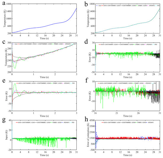 As shown in Figure 8a (the reference temperature trajectory of Equation (62)) and Figure 8, the fitting curve wall temperature of the surface contour from an X-43A wing in time sequence is chosen as a reference trajectory, which is from 234.2 k in 0 s to 1711.79 k in 31 s. From Figure 8b,c, these controllers have a silimar trend about the tracking dynamic performances. At the beginning, from 1.0 s to 3.0 s, the ANN-GNFTSMMFC-LESO controller has the shortest response time and other cotrollers have overshoot phenomena with different levels. From Figure 8d,e, chattering phenomena occur in the TSMFC-LESO controller because of the traditional TSM surface with a high-frequency switching phase during the whole process. In Figure 8f, chattering phenomena occur in the GNFTSMMFC-LESO controller at a later time from 24 s to 31 s, due to the lack of the auxiliary controller ANN, leading to estimation error accumulation. In Figure 8g,h, it is apparent that the ANN-GNFTSMMFC-LESO controller has the smallest input and estimation error due to the combined effects of MFC, GNFTSMC and ANN.