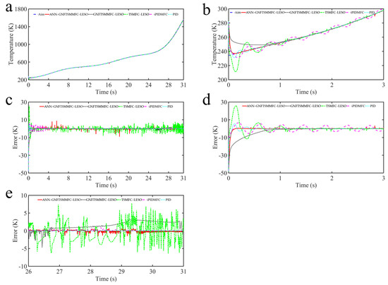 Simulation results with extra disturbances. (a) Tracking temperature trajectory and (b) partially enlarged figure details. (c) Tracking error and (d,e) partially enlarged figure details.