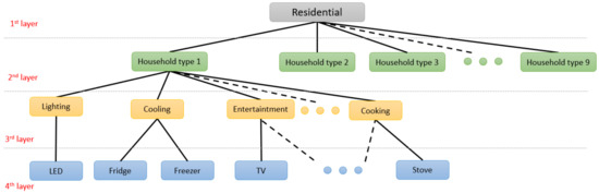 Each of the three sectors, residential & buildings (R), industry (I) and transport (T), has standardized sub-structures and applications. The residential sector R (first layer) has a list of household types (second layer) and each household type has a standard set of services (third layer), such as ‘lighting’, ‘cooling’ or ‘entertainment’. Finally, the applications for each of the services are defined (fourth layer), such as refrigerator or freezer for ‘cooling’. The energy intensity of each application can be altered by the modeler to reflect the status quo in a certain region and/or to reflect improvements in energy efficiency. An illustrative example of the residential sector layers is shown in Figure 2.