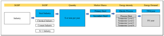 Figure 3 shows an example of the model structure of the industry sector. In the second layer, there are different industries—the OECM uses the GICS classification system for industry sub-sectors. The quantity of energy for each of the sub-sectors is driven by either GDP or the projected quantity of a product, such as the tons of steel produced per year. The market shares of specific manufacturing processes are defined and each process has a specific energy intensity for electricity, (process) heat, and/or fuels.