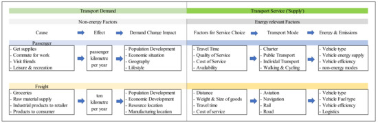 In this example, the energy intensity for an LDV with an internal combustion engine (ICE) is, for example, 1.5 MJ/km. The use of the application (=vehicle) is 15,000 km per year, which defines the demand (1.5 MJ/km × 15,000 km/yr = 22,500 MJ/yr). The application, in this example, an LDV with ICE, can be replaced with another technology, such as an electric vehicle with a reduced energy intensity of 0.5 MJ/km. The transport energy demand decreases, while the transport service (15,000 km) remains stable. In a second step, the actual transport service can be reduced or increased, or shifted to another transport mode (such as light rail) by the modeler.