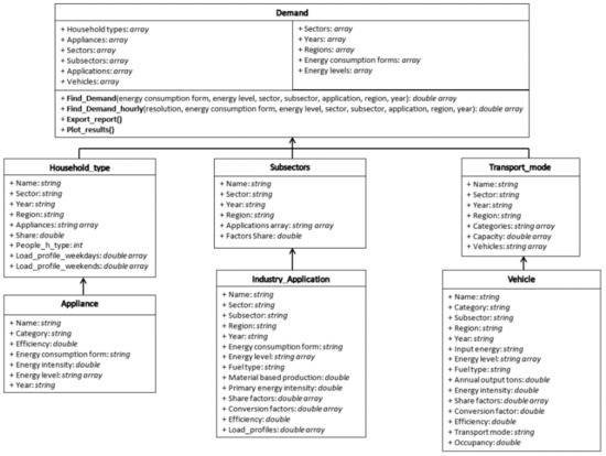 Table 14. Methods within the demand class. - Supply technology class: This class is used to define supply technologies. Attributes include name, type, efficiency, year, region and energy supply form and are defined as text inputs. Additional attributes are defined as numerical inputs, such as lifetime, cost and capacity factors. The structure adopted allows the addition of new attributes if required. This class has methods that are used by the main supply class to calculate the primary fuel, emissions, or installed capacity of a specific technology.