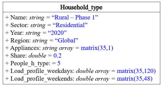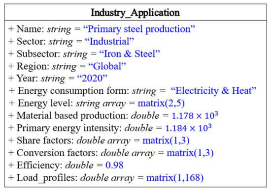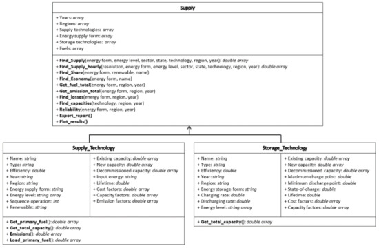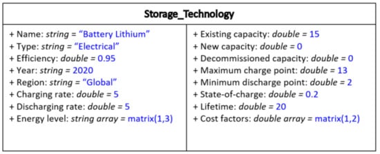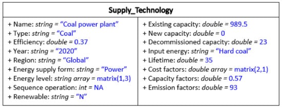 Figure 9 and Figure 10 show the high-level class definitions for supply technologies and storage objects, respectively. The text in blue indicates the defined value for each attribute. For example, the supply technology object in Figure 9 has the name “coal power plant”; its input energy is defined as hard coal, and the object is associated with the electricity energy form. The attributes in Figure 9 consider the year 2020 and a global scenario. For example, the existing capacity is defined as 989.5 GW and the decommissioned capacity is 23 GW. The lifetime of this object is 35 years.