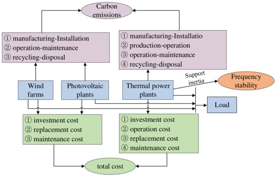 From the perspective of system environmental protection, the whole life cycle of a power system generally includes four segments: manufacturing and installation, production and operation, operation and maintenance, and recycling and disposal. Wind power and photovoltaic power generation do not generate carbon emissions in the production and operation stages, and their carbon emissions are mainly concentrated in the remaining three stages. Thermal power generation generates carbon emissions in all four stages [17]. Thermal power generation, wind power generation, and photovoltaic power generation all produce carbon emissions during the whole life cycle of the system, but the carbon emission rate of thermal power generation is significantly greater than that of wind power generation and photovoltaic power generation. From the perspective of system stability, thermal power units can provide the rotational inertia required when the system is disturbed, which can effectively suppress the frequency fluctuations caused by faults in the system and is conducive to the frequency stability of the system. As wind turbines and photovoltaic battery units have power electronic characteristics, their transmission power is decoupled from the grid frequency and cannot provide inertia support to the system directly. Therefore, wind power and photovoltaic weaken the system after they replace thermal power units on a large scale to generate electricity. The level of inertia support is weakened by the large-scale replacement of thermal power units by wind power and photovoltaic, which affects system stability. From the perspective of system economics, the total cost of a thermal power plant consists of equipment investment costs, operating costs, replacement costs, and maintenance costs. Excluding the operating costs of wind power and photovoltaic power generation, the total cost of wind farms and photovoltaic power plants consists of equipment investment costs, replacement costs, and maintenance costs [18,19]. Figure 1 shows the total system cost and system carbon emission characteristics.