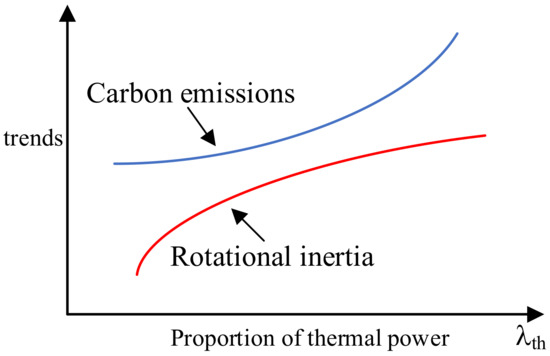 Figure 2 shows that the thermal share of the system is positively correlated with carbon emissions; it is positively correlated with rotational inertia. When the share of thermal power increases, the carbon emission of the system accelerates and the rotational inertia of the system increases, which is conducive to improving stability. When the share of thermal power decreases, the carbon emission of the system decreases, the rotational inertia of the system decreases, and the stability of the system decreases.