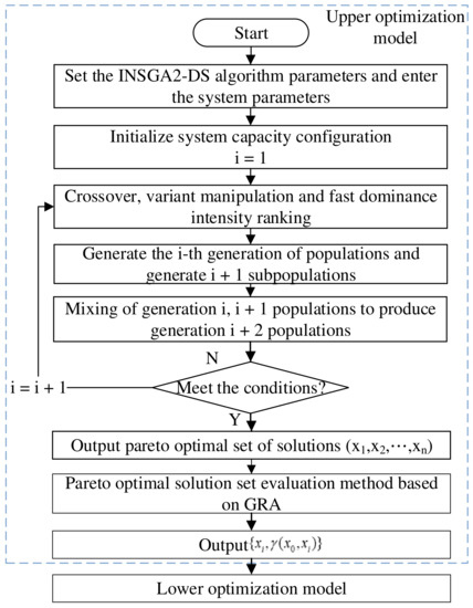 The INSGA2-DS algorithm based on dominance strength uses (1) an improved fast sorting method based on dominance strength, (2) a novel distance algorithm that introduces the consideration of variance, and (3) a strategy of adaptive elite retention based on the NSGA-II algorithm. The improved algorithms can effectively improve the convergence and distribution problems of the NSGA-II algorithm. The introduction of the INSGA2-DS algorithm in this paper can effectively improve the distributivity and accuracy of the system capacity allocation scheme, avoid the flooding of good data, reduce the solution time, and improve the solution efficiency of the algorithm. Figure 4 shows the flow chart of the upper optimization model solution.