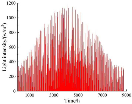 where is the output power of the PV cell; is the output power of the PV cell under standard conditions; is the light intensity under standard conditions; is the light intensity under actual conditions; is the power temperature coefficient, taken as −0.5%/°C; is the temperature of the PV cell under actual conditions; is the reference temperature value, taken as 25 °C.