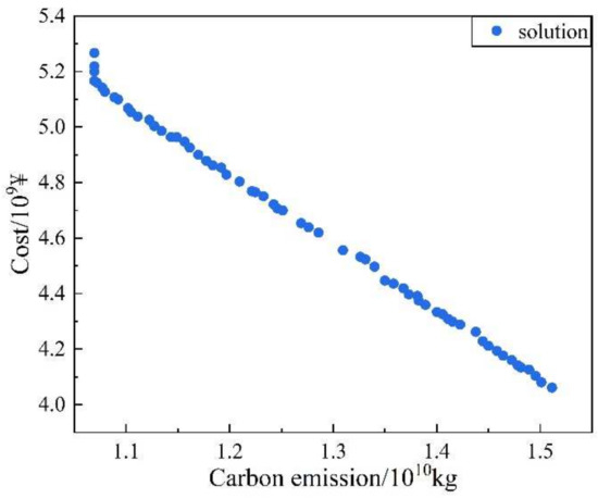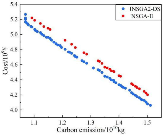 To verify the superiority of INSGA2-DS in solving capacity planning problems, the NSGA-II algorithm was used for comparative analysis. As shown in Figure 22, the Pareto frontier solution is more widely distributed and can effectively avoid getting trapped in a local optimum.