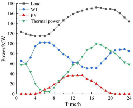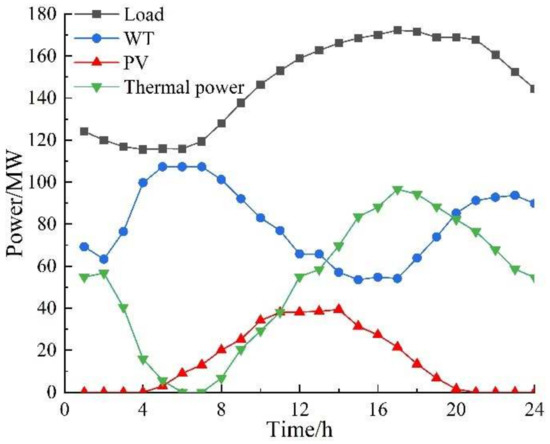 where , , and are the carbon emission factors of wind, photovoltaic and thermal power respectively for the whole life cycle of the system; , , represent the output power of the first wind turbine; , , and are the number of wind turbines, photovoltaic cells, and synchronous machines respectively; , , and are the switching states of wind turbines, photovoltaic cells, and synchronous units respectively.