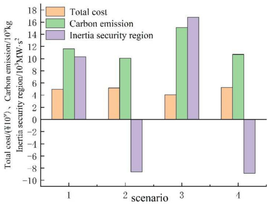 As can be seen from Figure 21, the inertia security region for scenarios 2 and 4 is negative, which is because the new energy output is higher during a typical day and the thermal units are in a lower output state, resulting in the actual inertia level of the system is lower than the system safety critical inertia value, and therefore scenarios 2 and 4 have a frequency stability risk. As the typical day is the maximum day scenario of the yearly limit expected fault occurrence, the inertia security region of scenarios 1 and 3 are 10,308.2 MW·s2 and 16,802 MW·s2 respectively, so there are no negative inertia margin operation scenarios for scenarios 1 and 3 during the yearly operation.