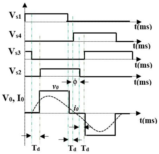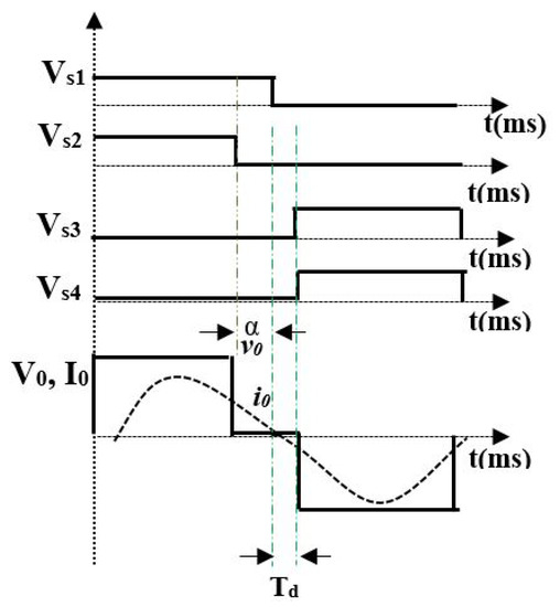 For soft switching and power control, asymmetrical duty cycle control is used [28,29]. In this control scheme, the output voltage waveform is made asymmetric, which results in a large dead band for zero crossing of the current. Additionally, the output power is controlled by varying the rms value of the output voltage. Typical waveforms of asymmetric duty cycle control are shown in Figure 4. Because of the asymmetrical voltage waveform, even harmonics will be produced. The expression governing the AVC is given by [29]
