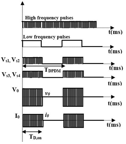 Pulse density modulation is one of the most commonly used techniques for controlling the output power without changing the switching frequency. A constant resonance frequency is maintained throughout the entire switching operation. The density of the switching pulses is varied in order to control the output power by contrasting the high-frequency switching pulses with the low-frequency pulses in compliance with the load specifications. The typical waveforms of pulse density modulation control are shown in Figure 5. The output power expression is given by [30]