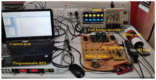The experimental validation of a bifilar coil-based IH system was performed using an FB inverter with four H20R1203 IGBT power switches. Various control techniques were implemented using PIC16F877A micro controller to obtain HFAC at the load terminal. The TLP250 driver IC amplifies the switching pulses, the SIGLENT CP4060 current probe is used to measure the current, and the digital oscilloscope MDO3024 was used to record the waveform. The advanced FLIR E75 24 thermal imager was used to record the thermal distribution of the load.