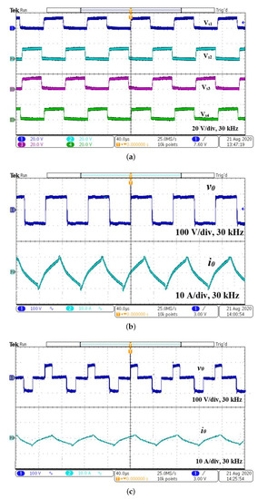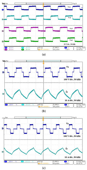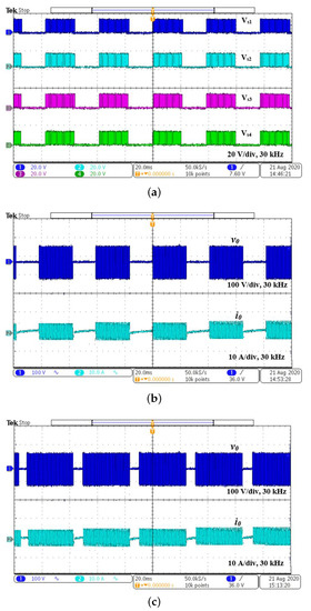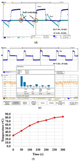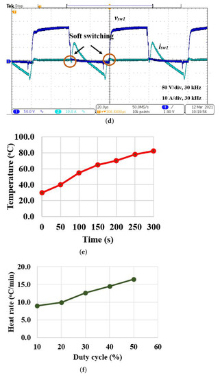 The experimental waveforms for PDM-based control is shown in Figure 11. The switching pulses and output voltage and the current for = 60% are shown in Figure 11a,b, respectively. For 60% , according to Equation (9), the calculated = 500 × 0.6 = 300 W. The rms value of the output current is 5.48 A, and is 5.48 × 10 = 300 W. The input power is 80 × 4.36 = 348.8 W. The efficiency for various is given in Table 6. The output voltage and current waveforms for = 90% are shown in Figure 11c. As switching frequency is not varied, resonance is maintained for the entire range of operation. The output power is controlled for the ranging from 0% to 100%. The variation of temperature is shown in Figure 11d. The heat rate for various is shown in Figure 11e and FLIR thermal image for various for a fixed time period (5 min) is shown in Figure 11f. The temperature varies with respect to .