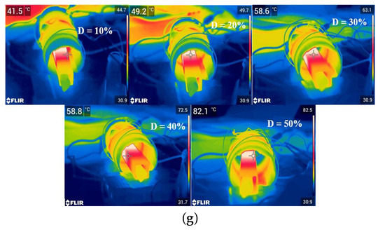 The experimental results of the IH system with pulse duty cycle control are shown in Figure 7. The switching pulses and output voltage and current waveforms for 50% pulse duty cycle are shown in Figure 7a,b, respectively. The output voltage and current waveforms for 10% pulse duty cycle is shown in Figure 7c. The pulse width variation reduces and . At 50% pulse duty cycle and 30 kHz switching frequency, the rms value of the output voltage is 70.71 V and the current is 7.07 A. The output power is 7.07 × 10 = 500 W for 10 equivalent resistance. The input power is calculated as = 80 × 6.97 = 558 W. The efficiency for 500 W is 89.6%, and for other pulse duty cycle, it is given in Table 2. As it draws more current from the supply, for lower values of duty cycle, the efficiency of the system decreases. The switch () voltage and current waveforms for 50% pulse duty cycle are shown in Figure 7d. It is inferred that soft switching exists during the on and off periods, which reduces the switching losses. The variation in the temperature with respect to time for 500 W output power is illustrated in Figure 7e. A temperature rise is noted for various duty cycle with the time interval of 5 min, and the heat rate is calculated. The heat rate for various duty cycles is shown in Figure 7f. It is noted that the heat increases and attains 82.5 C at 50% duty cycle for a period of 5 min. The thermal image for various pulse duty cycle is illustrated in Figure 7g. It is inferred that the heat increases with an increase in pulse duty cycle. The pulse duty ratio with 50% denotes a 50% positive half cycle and a 50% negative half cycle for the 180 conduction mode in which the corresponding load voltage duty ratio is 100%.