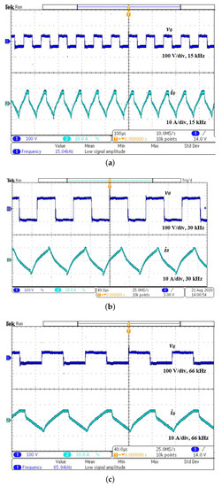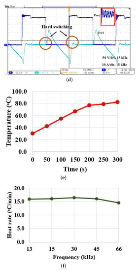 The experimental results of variable frequency control are shown in Figure 8. The resonance frequency is 29.5 kHz, and the switching frequency is varied from 13 kHz to 66 kHz to control the output power. The output voltage and the current observed at 15 kHz switching frequency is shown in Figure 8a. The output voltage and current waveforms for 30 kHz and 66 kHz are shown in Figure 8b,c, respectively. For a 66 kHz switching frequency, according to Equation (2), = 0.82 × 500 = 410 W. The rms value of the current at 66 kHz switching frequency is 6.4 A and is 6.4 × 10 = 410 W. The input power is 80 × 6.4 = 512 W. The efficiency for 66 kHz is 80.1%, and it is presented for other switching frequencies in Table 3. It is observed that efficiency is maximum for the resonance condition, and the efficiency is reduced both below and above the resonance frequency due to switching losses. The switch voltage and current waveforms for 15 kHz are shown in Figure 8d. It is observed that hard switching is realized as switching frequency is far from the resonance frequency. As the switch is operated in hard switching mode, there exists a ringing effect on the output voltage waveform, which results in more switching loss and stress. Hence, it advisable to operate the inverter switch in resonant operating mode to reduce switching loss and stress. The temperature variation with respect to time is shown in Figure 8e. The heat rate for various switching frequencies are shown in Figure 8f and FLIR thermal image for various switching frequencies for a fixed time period (5 min) is illustrated in Figure 8g. The temperature varies with respect to the switching frequencies.As the switching frequency is varied, the inverter is operated in hard switching mode, which results in more switching loss. In addition, the frequency ringing effect, heat conversion losses, experimental coil design constraints, and capacitor selection restrict the efficiency to 86.9% in real-time implementation.