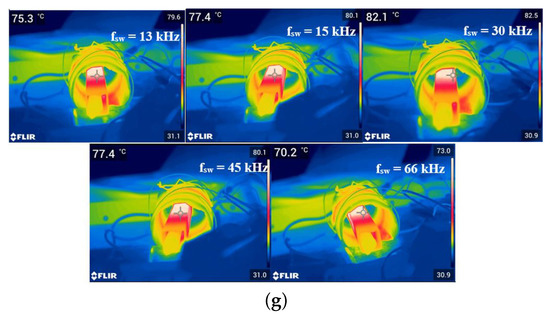 Variable frequency control: output voltage and current waveforms for (a) 15 kHz, (b) 30 kHz, and (c) 66 kHz switching frequency. (d) Switch voltage and current waveforms for 15 kHz switching frequency. (e) Temperature variation. (f) Heat rate for various switching frequencies. (g) FLIR thermal image for various switching frequencies at t = 5 min.