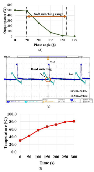 In phase shift control, the switching pulses are shifted with respect to the adjacent leg of the inverter. The variation in rms values of the output voltage and current changes the output power. The experimental results of PSC are shown in Figure 9. The switching pulses, and output voltage and current waveforms for = 20 are shown in Figure 9a,b, respectively. For = 20, according to Equation (5), is = 485 W. The rms value of the output current is 6.96 A and = 6.96 × 10 = 484 W. The input power is 80 × 6.96 = 557 W. The efficiency for various phase angle is given in Table 4. The output voltage and current waveforms for = 60 is represented in Figure 9c. The soft-switching range for phase shift control is shown in Figure 9d. It is inferred that inverter switches operate in soft switching for ranging from 0 to 168. The switch () voltage and current waveforms for = 170 are shown in Figure 9e, where the switch is operated in hard switching mode. The temperature variation with respect to time is shown in Figure 9f. The heat rate for various phase angles are shown in Figure 9g and FLIR thermal image for various phase angles for a fixed time period (5 min) is illustrated in Figure 9h. As the rms value of output voltage varies, the temperature decreases for an increase in phase angle.