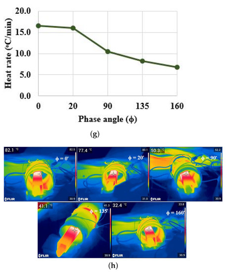Phase shift control. (a) Switching pulses for = 20. (b) Output voltage and current waveforms for = 20. (c) Output voltage and current waveforms for = 60. (d) Soft switching range. (e) Switch voltage and current waveforms for = 170. (f) Temperature variation. (g) Heat rate for various phases angles. (h) FLIR thermal image for various phase angles at t = 5 min.
