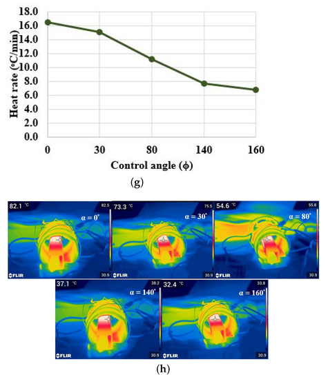 Asymmetrical duty control. (a) Switching pulses for = 30. (b) Output voltage and current waveforms for = 30. (c) Output voltage and current waveforms for = 140. (d) Switch voltage and current waveforms for = 30. (e) Harmonics spectrum for = 140. (f) Temperature variation. (g) Heat rate for various control angles. (h) FLIR thermal image for various control angles at t = 5 min.