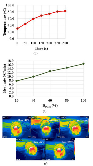 Pulse density modulation control. (a) Switching pulses for = 60%. (b) Output voltage and current waveforms for = 60%. (c) output voltage and current waveforms for = 90%. (d) Temperature variation. (e) Heat rate for various . (f) FLIR thermal image for various at t = 5 min.