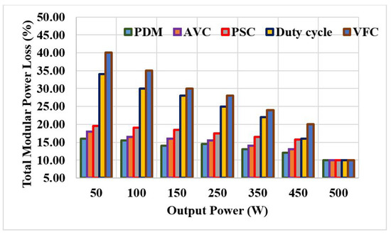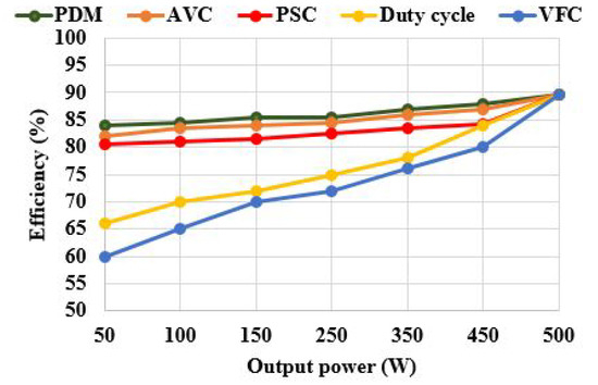 In this paper, the various power control techniques used for bifilar coil-based IH systems are discussed. The modular losses are calculated using the formula given in [19]. The modular losses (conduction and switching losses) are calculated to evaluate the best control technique. Figure 12 shows the comparison of total modular power loss with respect to output power. It is inferred that the losses are the same at the rated operating power (500 W) for various control methods. In the PDM control technique, the amount of input power drawn from the supply is at a minimum, which results in a minimum total modular loss as compared with other techniques for the same output power. Similarly, the variation in efficiency with respect to the output power is illustrated in Figure 13. The efficiency of the bifilar coil-based IH system varies between 60% to 89.6% for output power variation. Among the tested control techniques, the PDM control scheme yields higher efficiency (84% to 89.6%) with linear variations in the output power (0% to 100% of rated power).