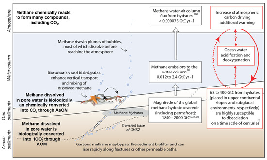 Recent modelling efforts (e.g., [19,20,21,22]) and field observations (e.g., [1,23,24,25,26,27]) suggest that anthropogenic ocean warming may be causing hydrate destabilisation in the contemporary ocean. Given the strong global warming potential of methane (i.e., 25 times higher than that of carbon dioxide [28]), a major concern is that the accelerating rates of ocean warming might release large amounts of methane stored in hydrates, further amplifying anthropologically driven global warming and accelerating the destabilisation of remaining hydrates [29]. However, on a global scale, hydrate-sourced methane emissions are forecast to have a minor impact on climate during this century [30] (neglecting contributions from abrupt methane release events such as those triggered by submarine slumps), in part owing to a highly efficient consumption of methane within the sediment-ocean continuum [2,12,20,31,32] (Figure 1).